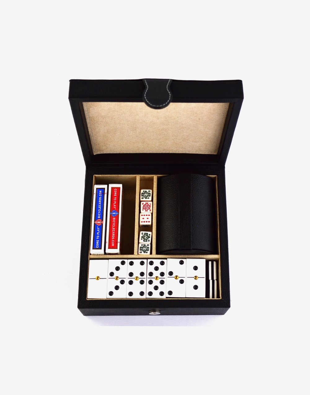 Diseño compacto listo para disfrutar con familiares y amigos a donde vayas, incluye juego de dominó, cubilete y 2 juegos de baraja americana.