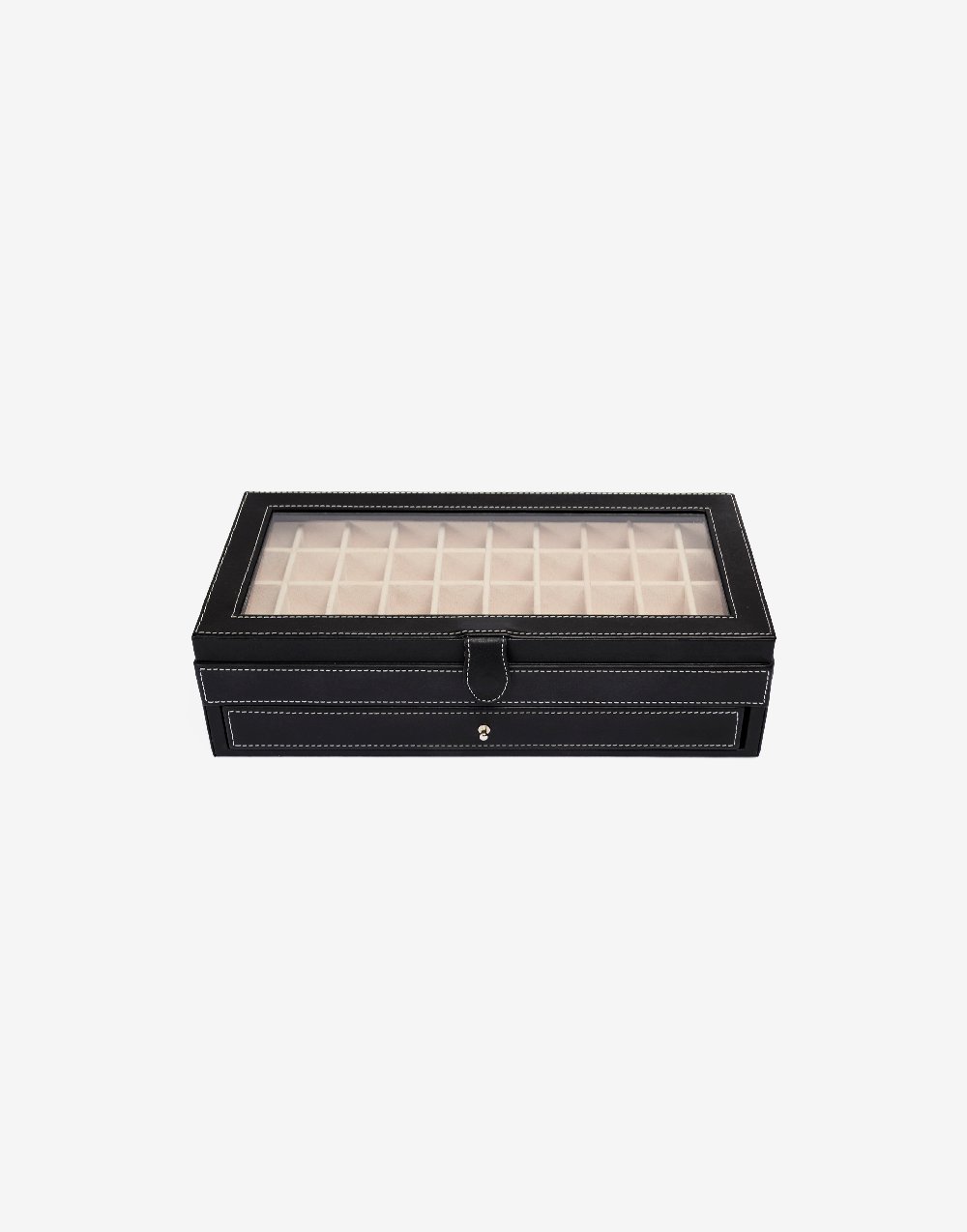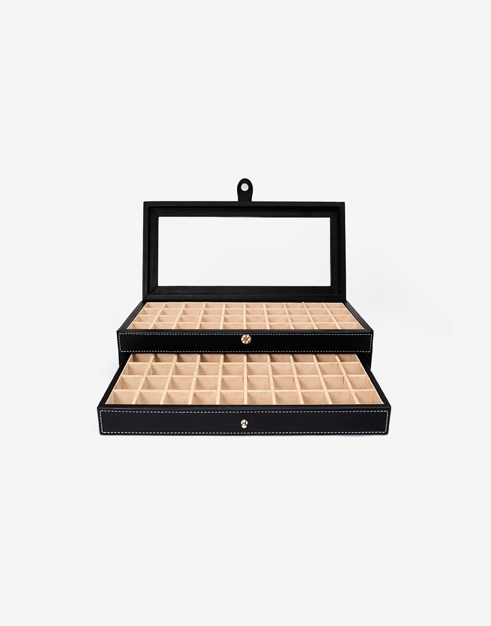 Protege y organiza tus aretes y anillos o mancuernillas con estilo con esta caja distribuido con cajón, con capacidad de 40 piezas por nivel en total para 80 piezas.