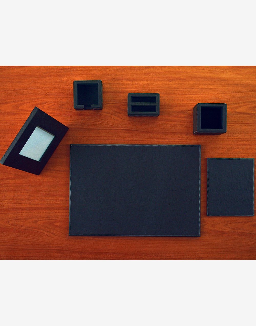 Incluye tapete para lap top, mouse pad sencillo, porta post-it, porta tarjetero doble, lapicera cubo y porta retrato deslizante mediano.